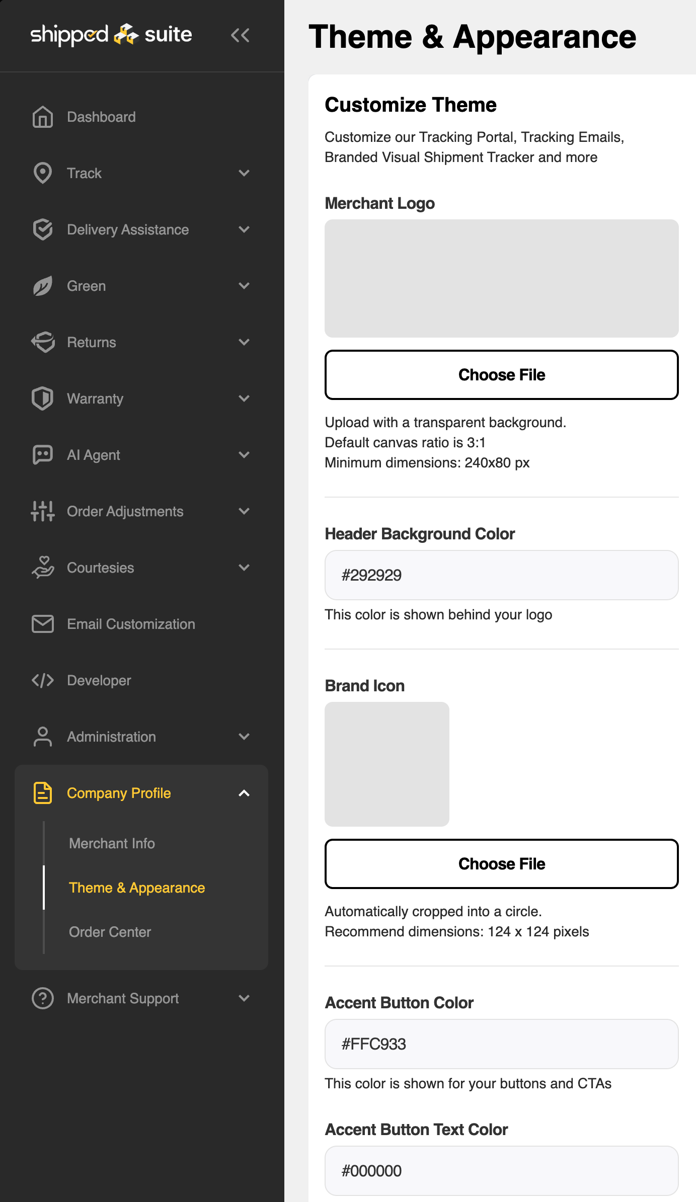 For Shopify, you can set the company logo and colors in Shipped Suite merchant admin: